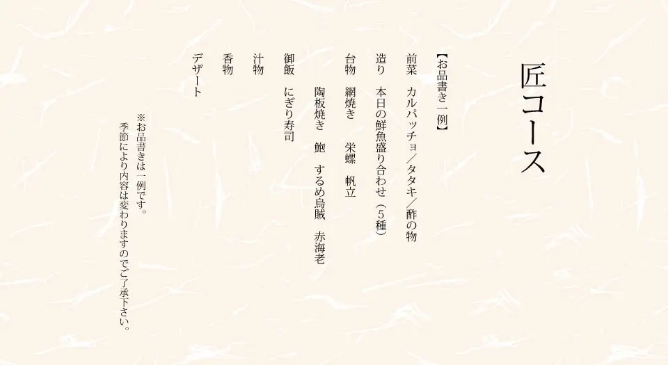 日本海でとれた新鮮な魚介類が楽しめます。特に甘エビや冬場の活かに料理は絶品。魚介類は料理長が厳選したものを、お出ししているので鮮度抜群。四季折々の日本海の旬の魚介類と旬の野菜・地の物を使ったお食事をご用意します。